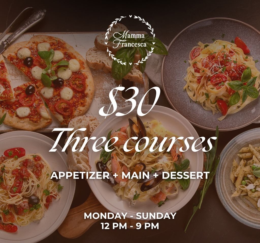 • The Three-Course Dinner Menu is priced at $30 per person.